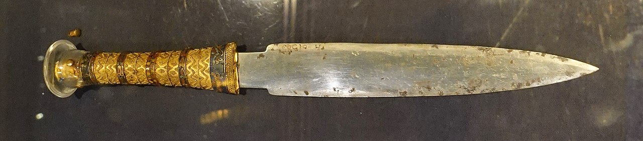 Iron from the sky was certainly known in at least Ancient Egyptian times. It would have been a rare and memorable event indeed to have witnessed a flaming meteorite fall from the heavens. Though much less malleable than gold, such iron rich meteorites would have been exceedingly precious gifts from the heavens indeed. A blade hammered out from such a stone would reflect the light in a similar manner to gold, but unlike gold it could cut and keep its edge. In English, in winter, when the earth is frozen solid, it is said to be as hard as iron.